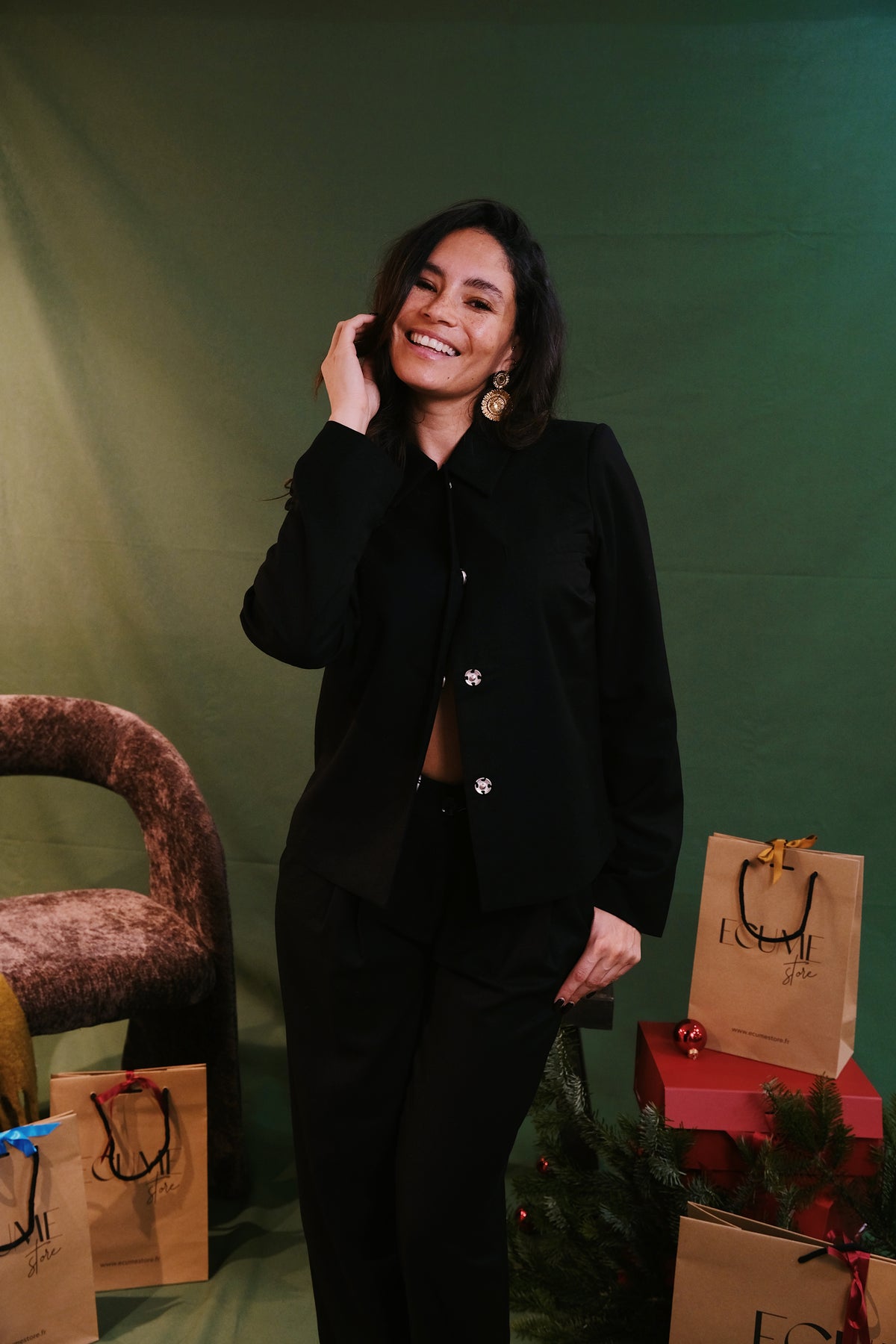 LUCIANA est une veste courte noire signée Minimum. Elle présente une coupe droite avec un col chemise et une fermeture à boutons-pression dissimulés sous une patte de boutonnage. Des épaulettes structurent la silhouette et apportent une touche élégante et sophistiquée à cette pièce intemporelle.