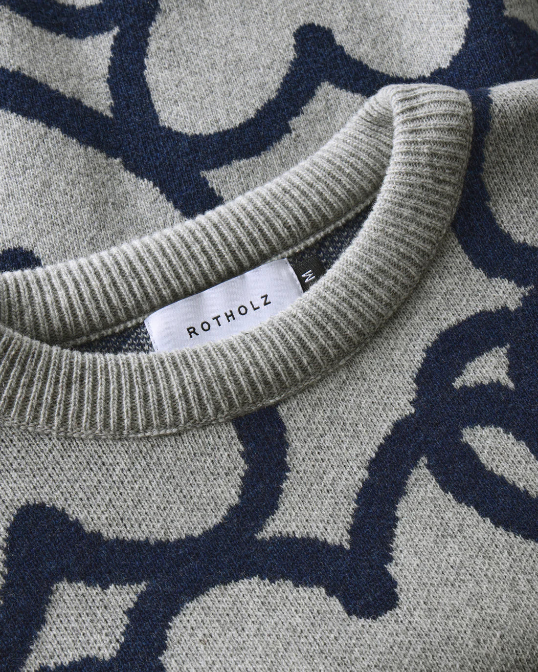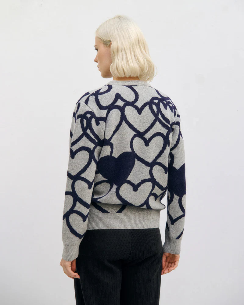 Le pull en maille Affection de Rotholz adopte une coupe droite avec un col rond. Confectionné dans un coloris gris, il est agrémenté de cœurs bleu marine. Les finitions côtelées au col, aux poignets et à la base soulignent son style intemporel.