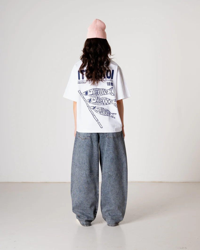 Le jean BROOKE de chez Woodbird a une coupe balloon fit avec une taille mi haute. Il est confectionné dans un légèrement gris. Le jean dispose de 5 poches, d'une fermeture à glissière et d'un bouton. Il possède des sur piqures sur le bas de la jambe.