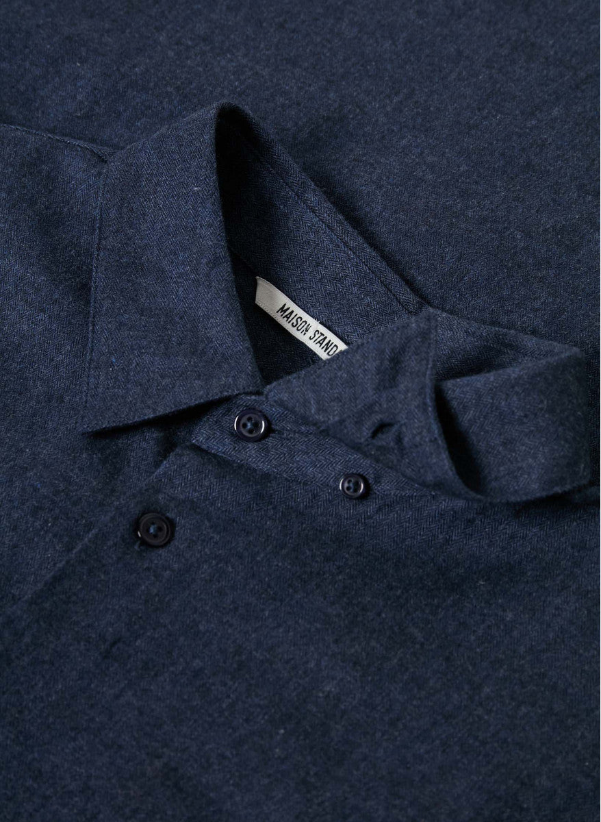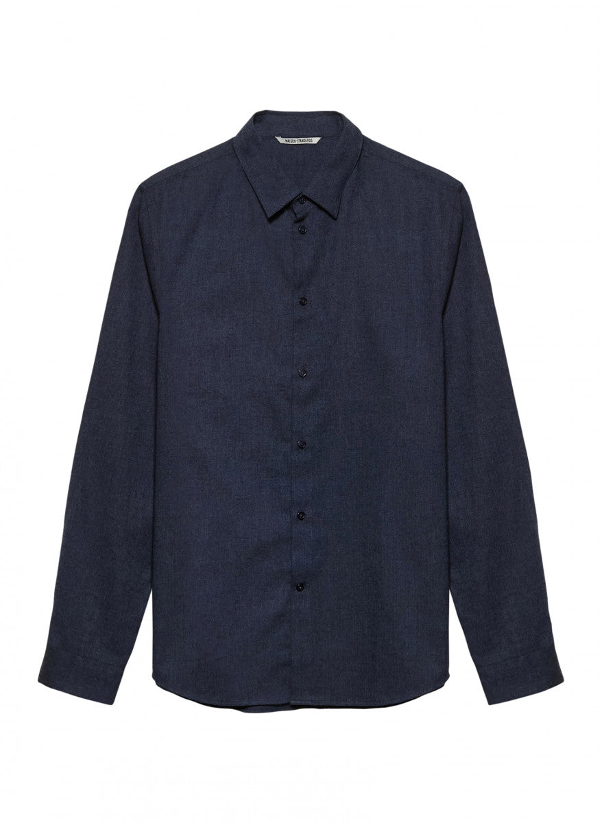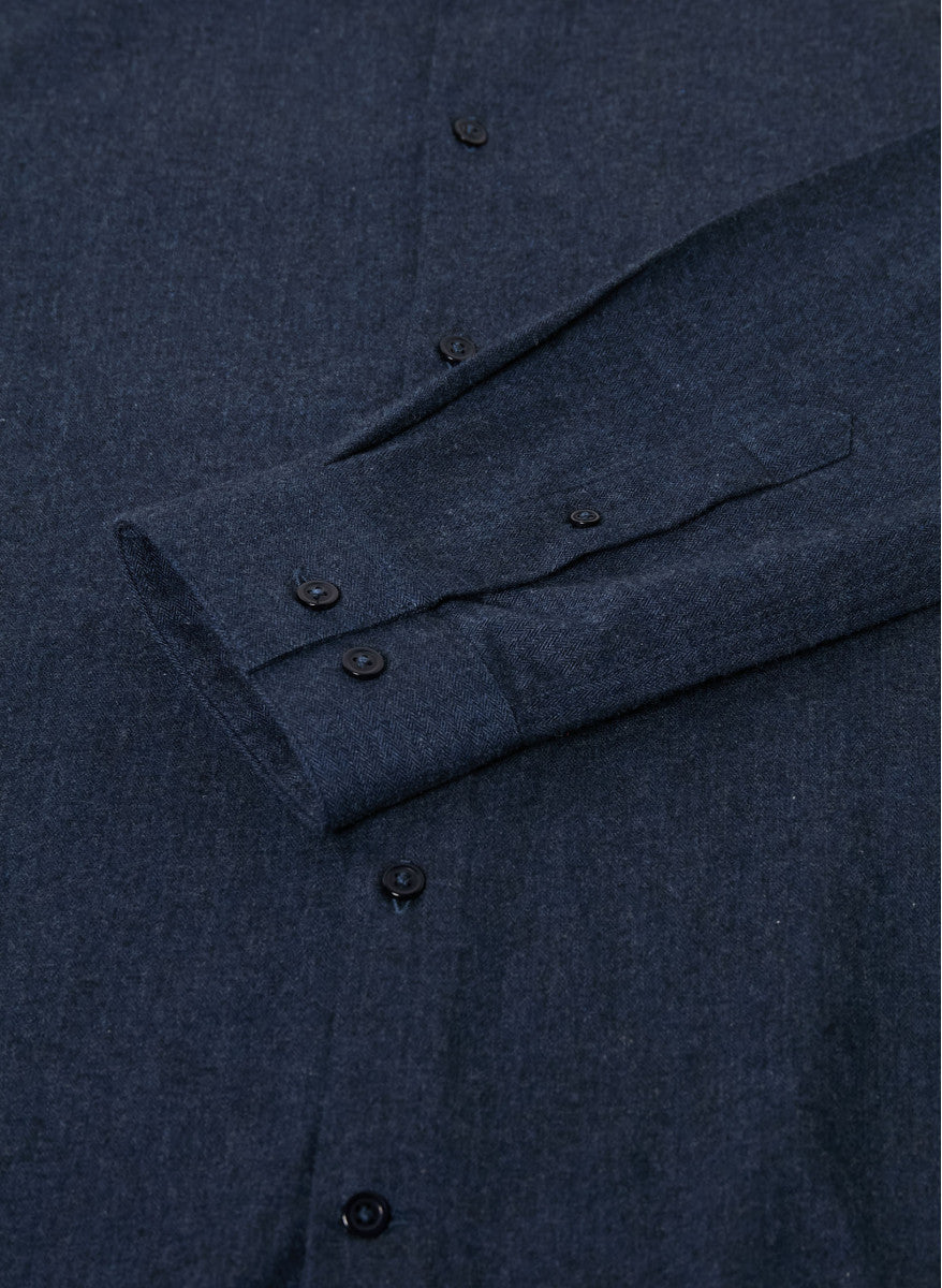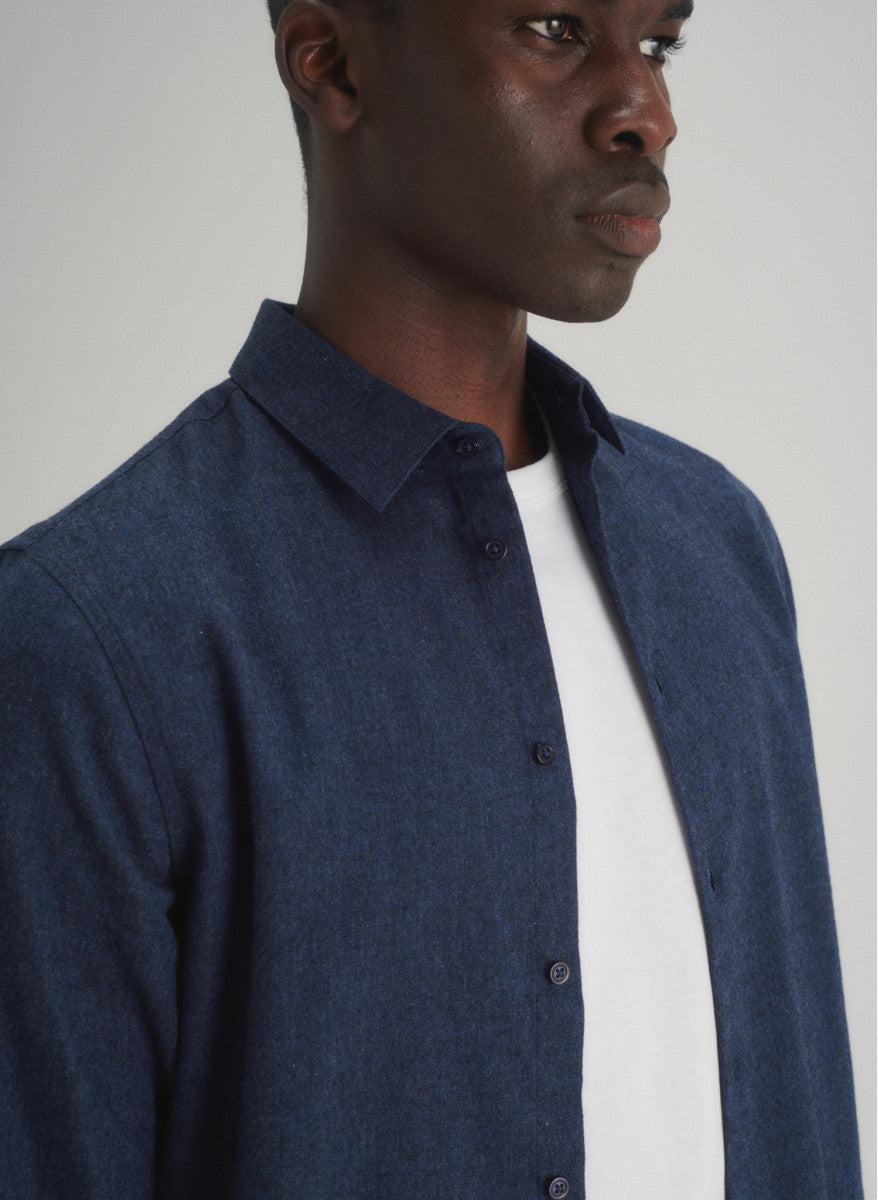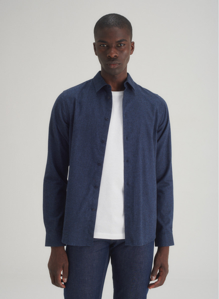 Notre chemise bleue nuit en flanelle est un essentiel intemporel du vestiaire. Elle présente une coupe ajustée avec un col rabattu avec des boutons dissimulés pour un maintien parfait. La fermeture s’effectue par une patte de boutonnage pliée, tandis que les poignets boutonnés ajoutent une finition soignée.