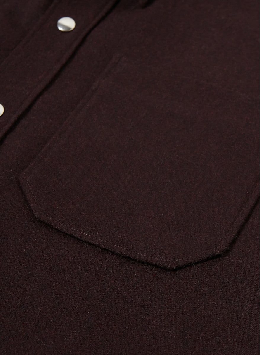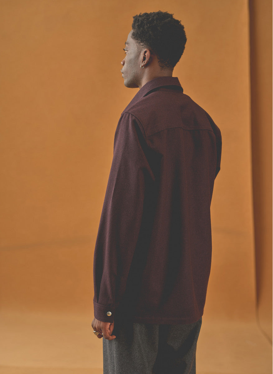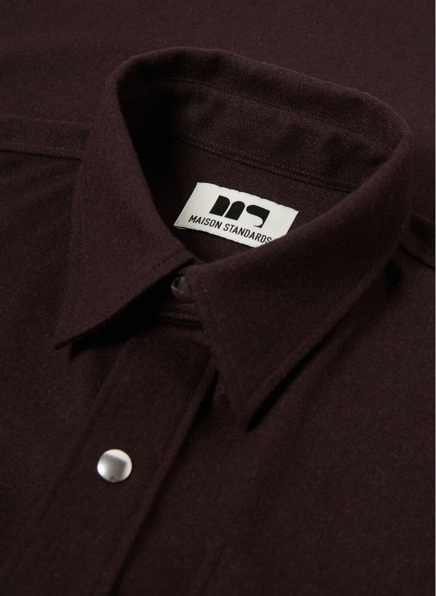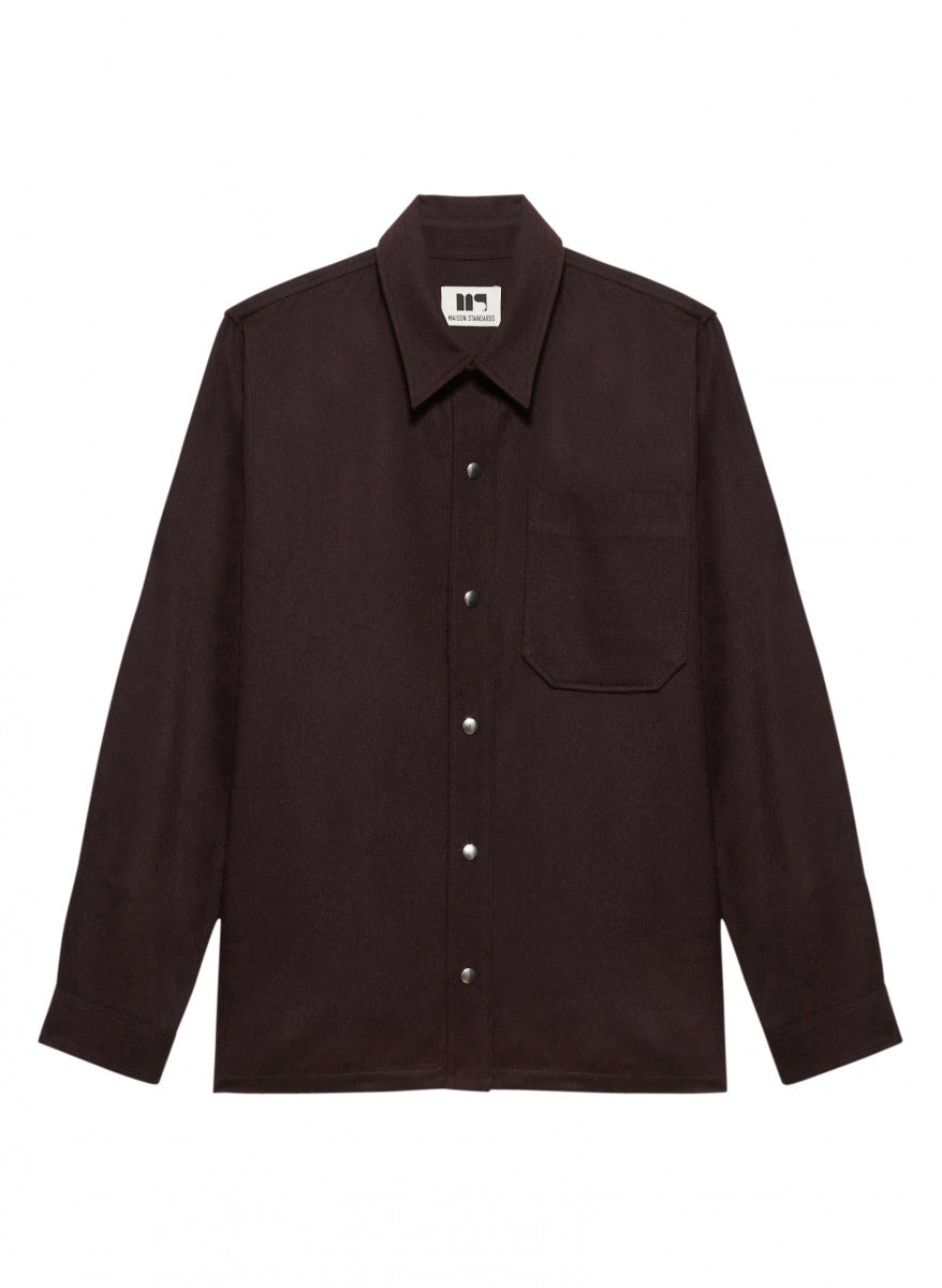 La surchemise bordeaux en flanelle est un intemporel du vestiaire d’hiver. de chez MAISON STANDARDS. Confectionnée dans une flanelle majoritairement composée de laine, elle offre chaleur et confort tout en conservant une allure élégante. Elle se distingue par son col plat surpiqué, sa fermeture à pressions métalliques et sa grande poche plaquée sur la poitrine.