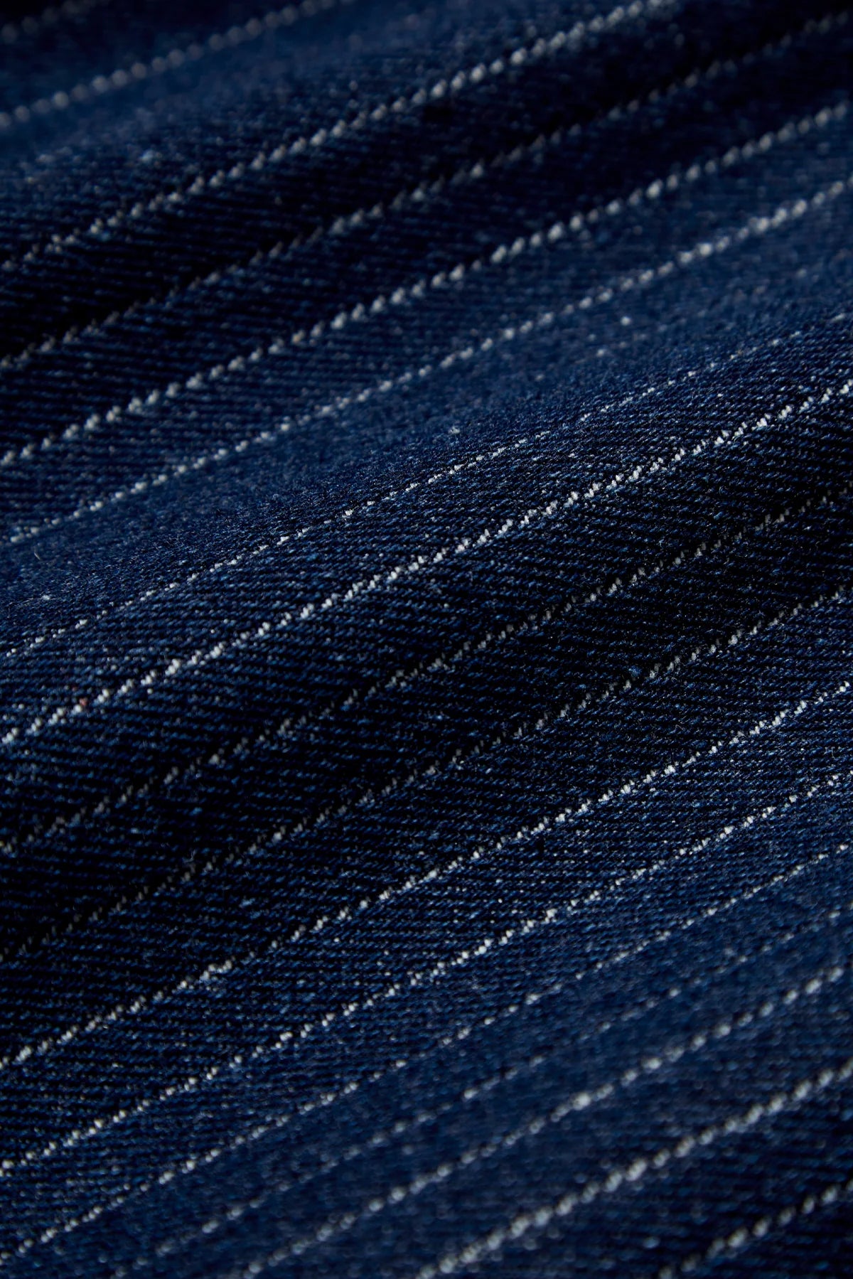 Pantalon droit en denim à 5 poches, fabriqué en coton et traité à l'indigo. Le lavage met en évidence un effet de rayures verticales qui résulte de la composition différente des fils de chaîne, ajoutant de la texture et de l'originalité au tissu sans perdre l'essence décontractée du denim.