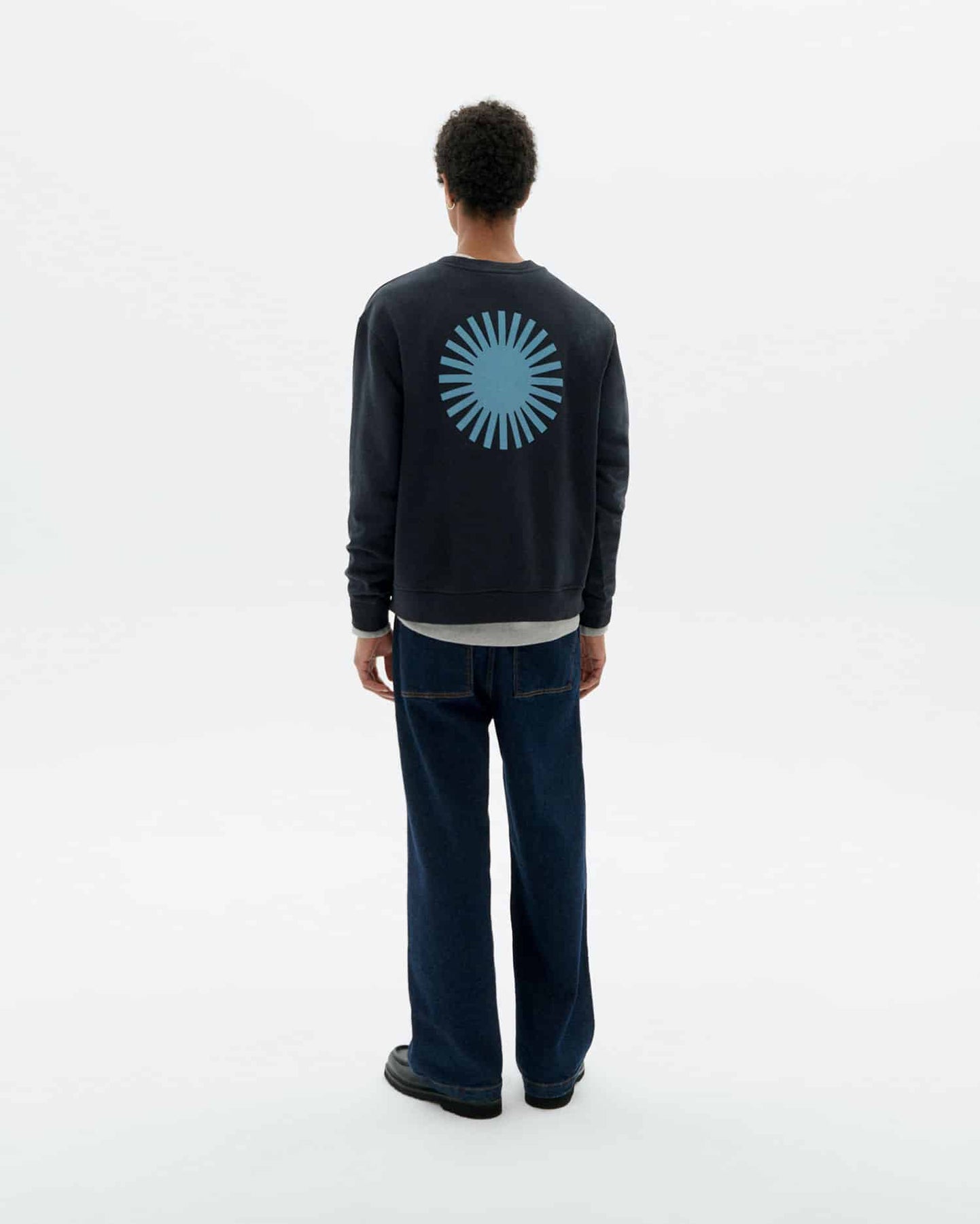 Sweat-shirt bleu marine en coton biologique épais (450 g/m²) allie confort et simplicité. Sa coupe régulière, son col rond et ses manches longues en font une pièce facile à porter au quotidien. Un patch logo Thinking MU est brodé sur la poitrine et un grand soleil bleu sérigraphié apporte une touche graphique au dos ainsi qu'un joli contraste avec le bleu marine.