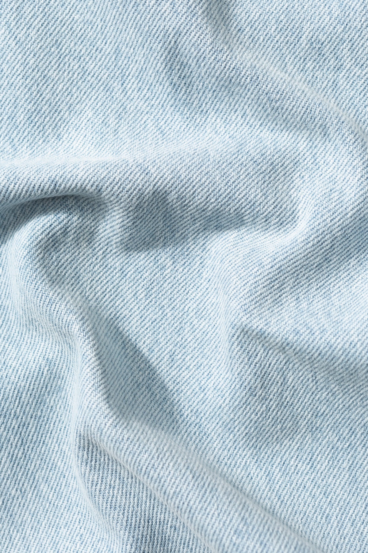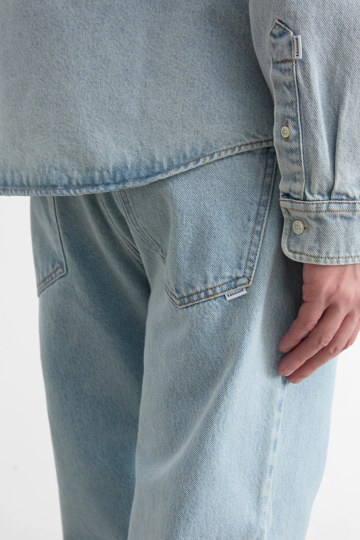 AVAIL est un jean clair coupe droite de chez Edmmond Studio  avec surpiqûres camel. Deux poches devant et deux à l'arrière.