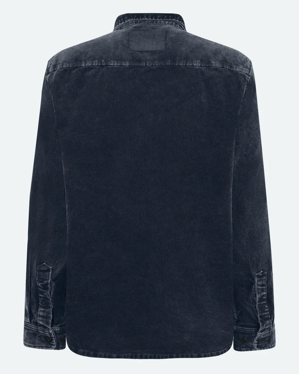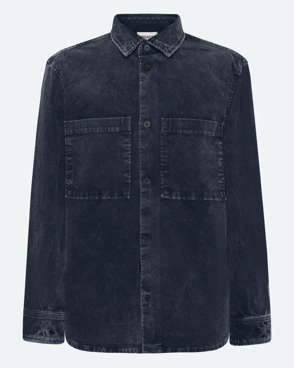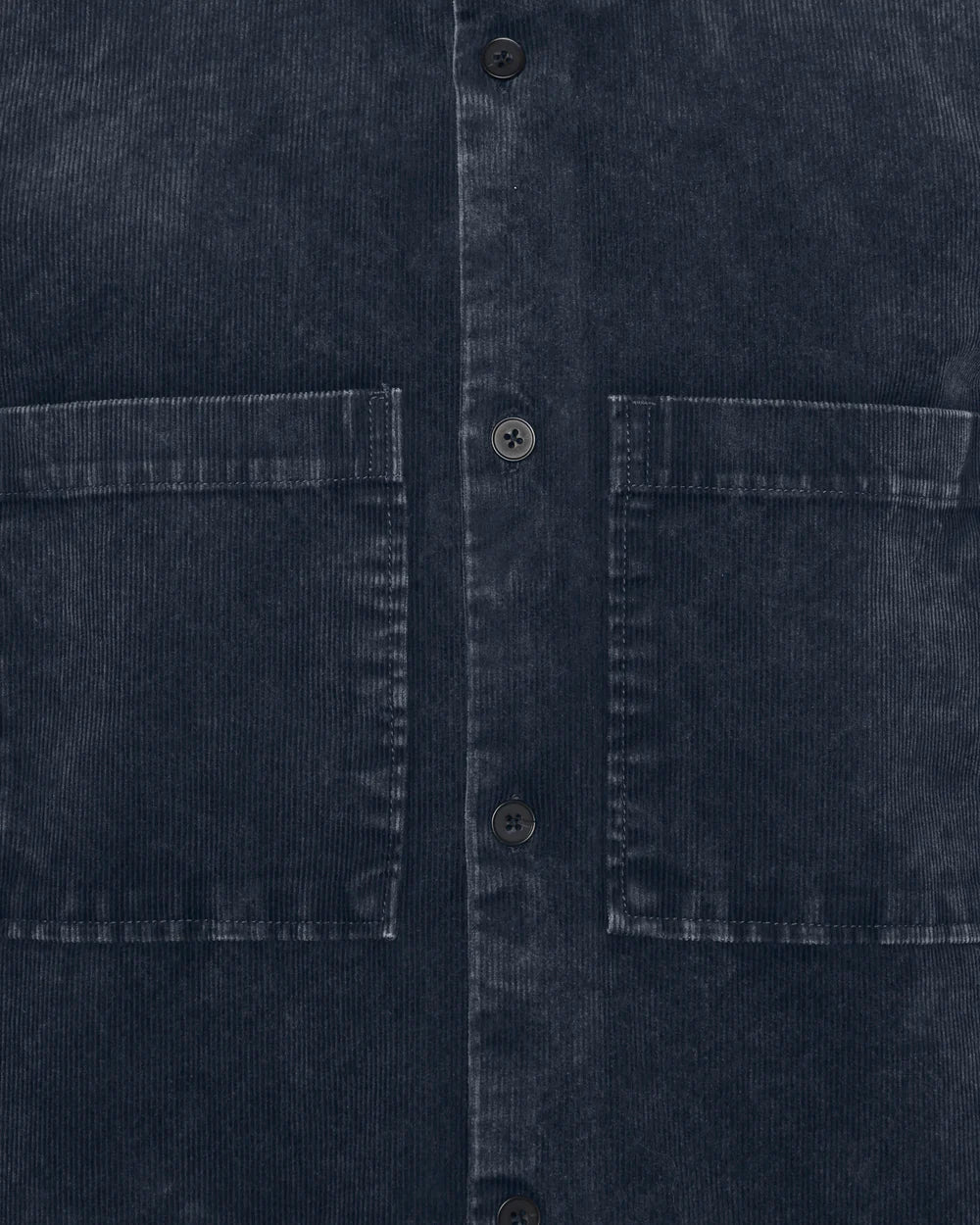 Surchemise en velours côtelé à fines côtes, de couleur bleu délavé. Elle présente une coupe droite, un col chemise classique, une fermeture boutonnée à l’avant et deux grandes poches carrées plaquées sur la poitrine.