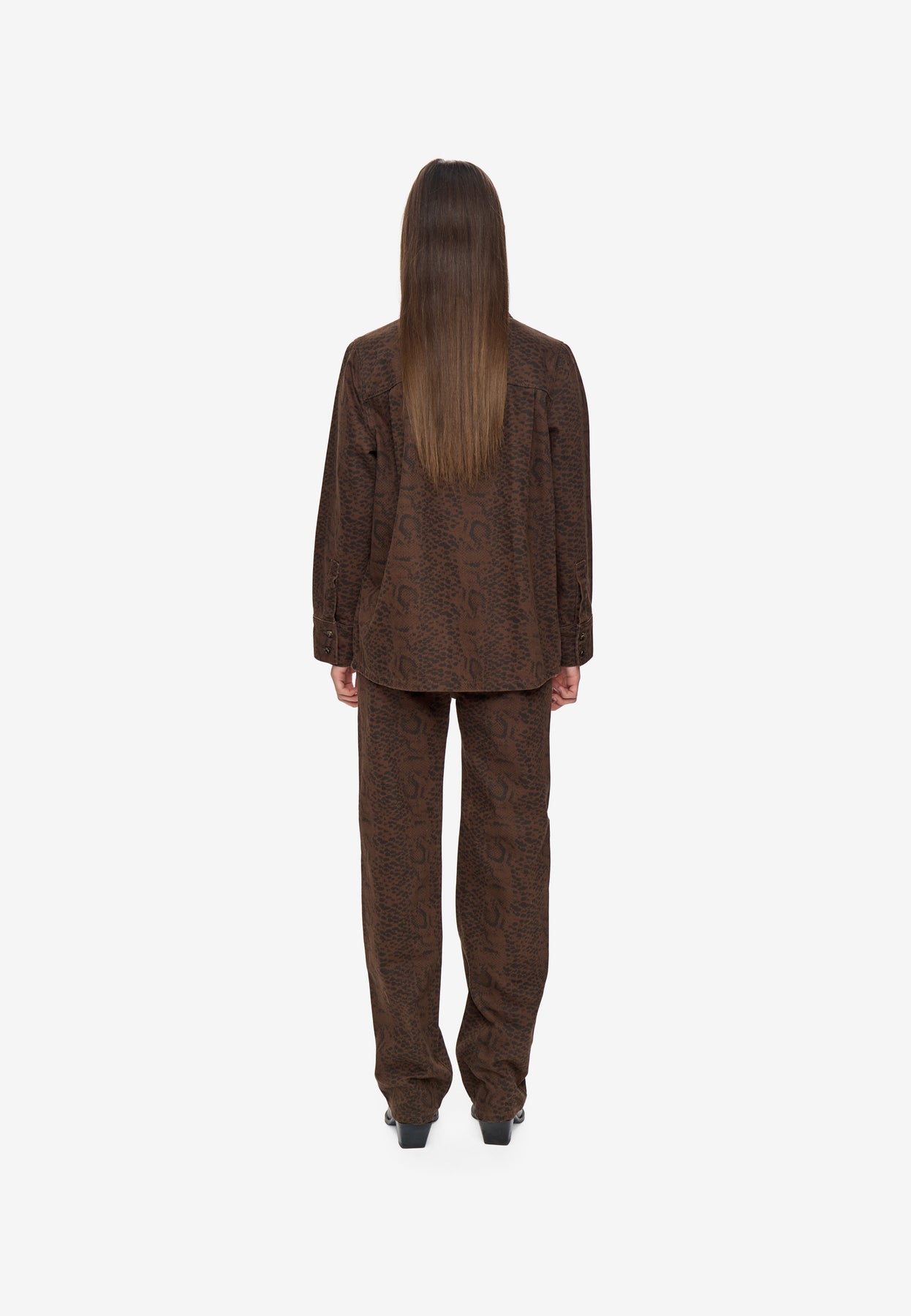 ANDREA est une veste surchemise signée Minimum. Elle présente une coupe droite avec un col chemise, une fermeture boutonnée sur le devant et des poignets également boutonnés. Son motif effet serpent noir sur fond marron apporte une touche originale et s’accorde parfaitement avec le pantalon assorti.