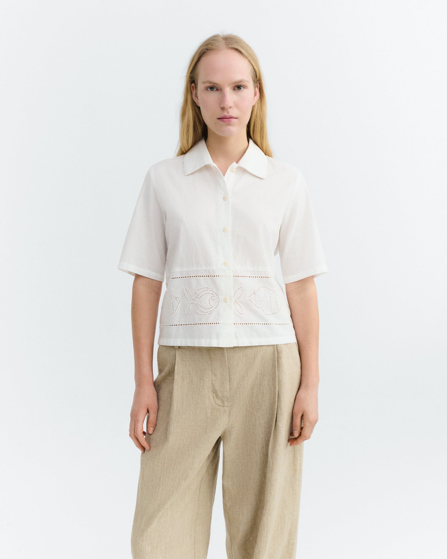 Chemisier à manches courtes blanc de chez THINKING MU. Il présente une coupe droite, un col chemise classique et une fermeture boutonnée à l’avant. Une bande brodée ajourée avec des motifs apporte une touche d’originalité et d’élégance au modèle.