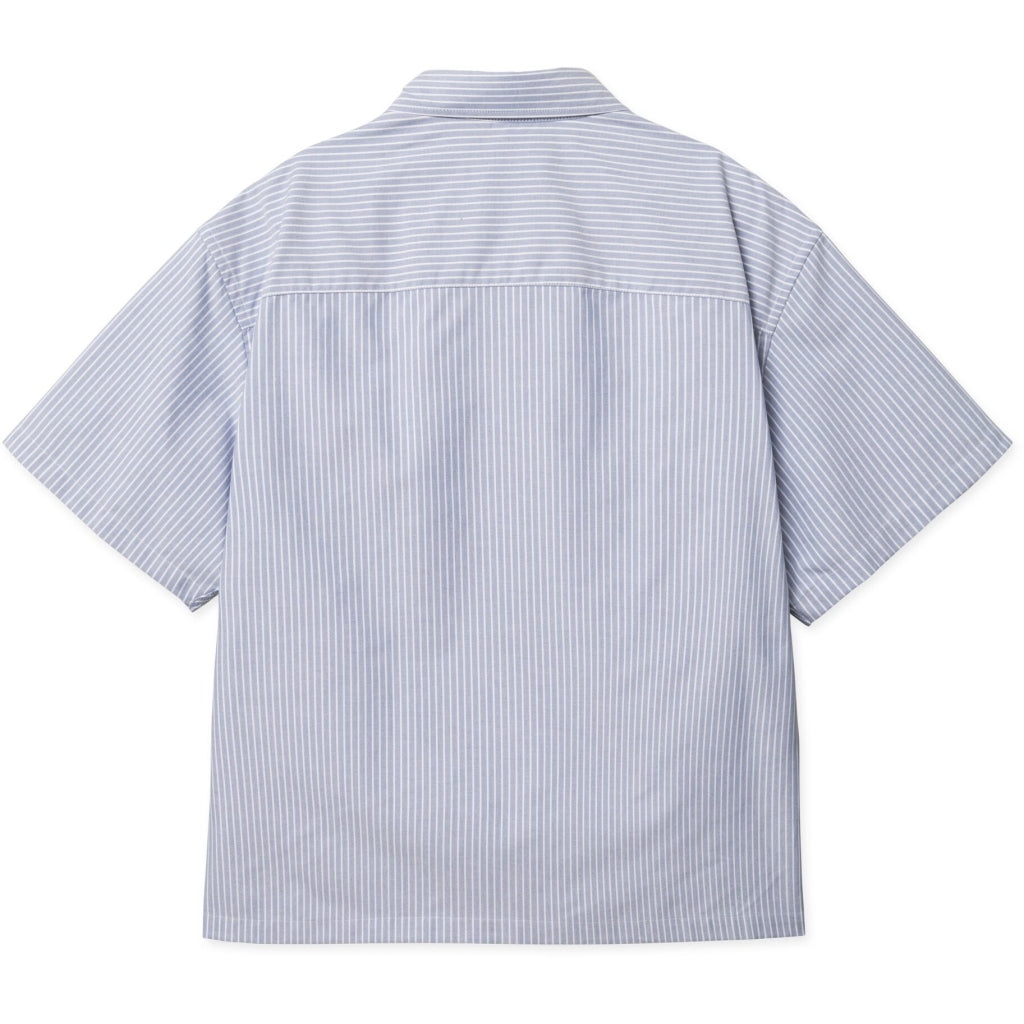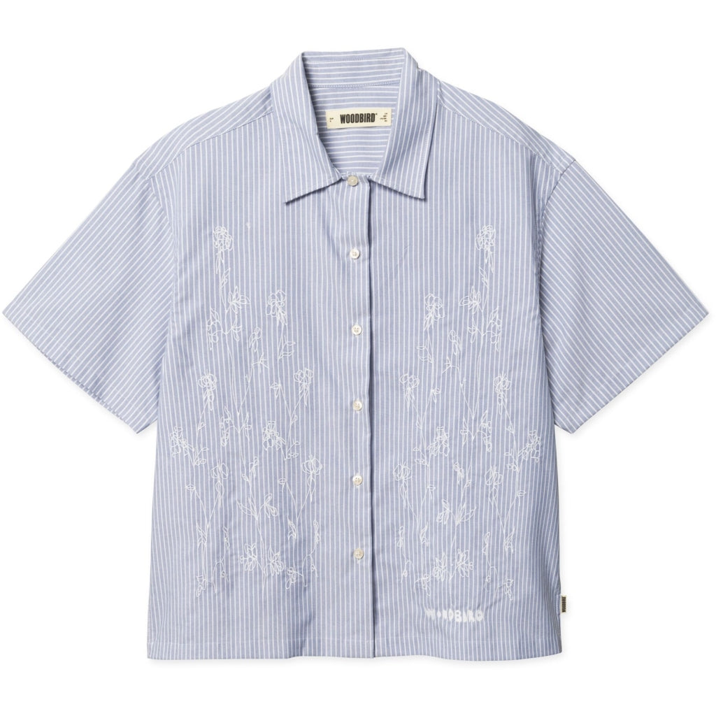 LUNA est une chemise à manches courtes de chez WOODBIRD. Elle présente une coupe droite légèrement masculine, un col chemise classique et des boutons blancs à l’avant. Elle est bleu ciel à rayures blanches. Pour un côté plus féminin, de petites broderies florales sont présentes à l’avant de la chemise.