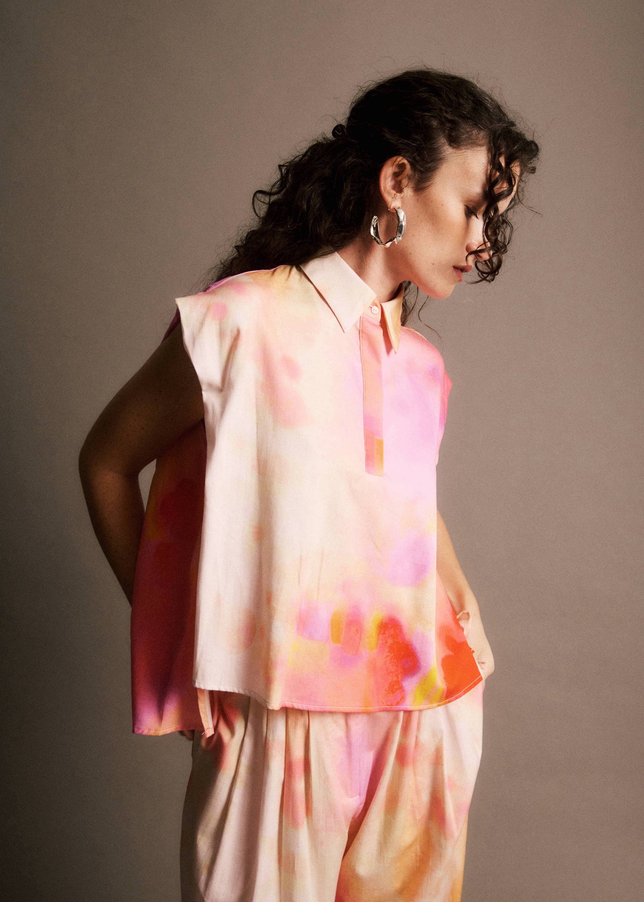 ADAM est un chemisier sans manches. Son imprimé coloré lui donne beaucoup de charme. Il possède un col classique avec des boutons sur le haut. Il a une coupe asymétrique, le dos est plus long.
