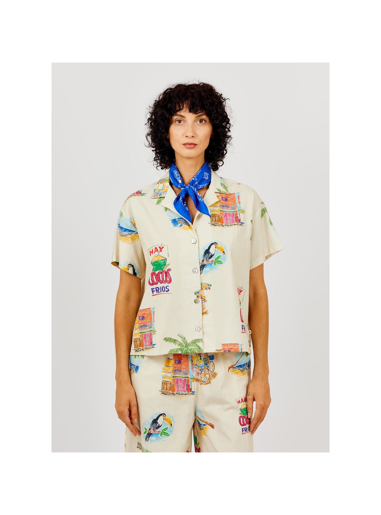 Chemise femme à imprimé exclusif Cocos Frios, confectionnée en twill 100 % coton. Elle présente un col magnum, des manches courtes et une ouverture boutonnée au milieu devant. Une étiquette à pois bleus est insérée dans la couture côté.