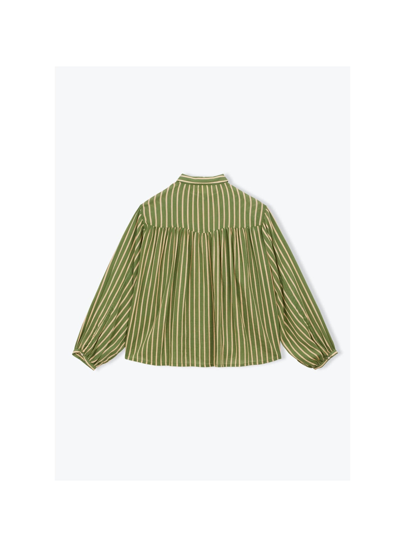 Chemise femme à rayures vert kaki en coton biologique certifié GOTS. Elle présente un col chemisier, une ouverture boutonnée sur le devant et des manches longues avec poignets. Les fronces à l’avant et sous la découpe dos apportent du volume et une touche féminine.