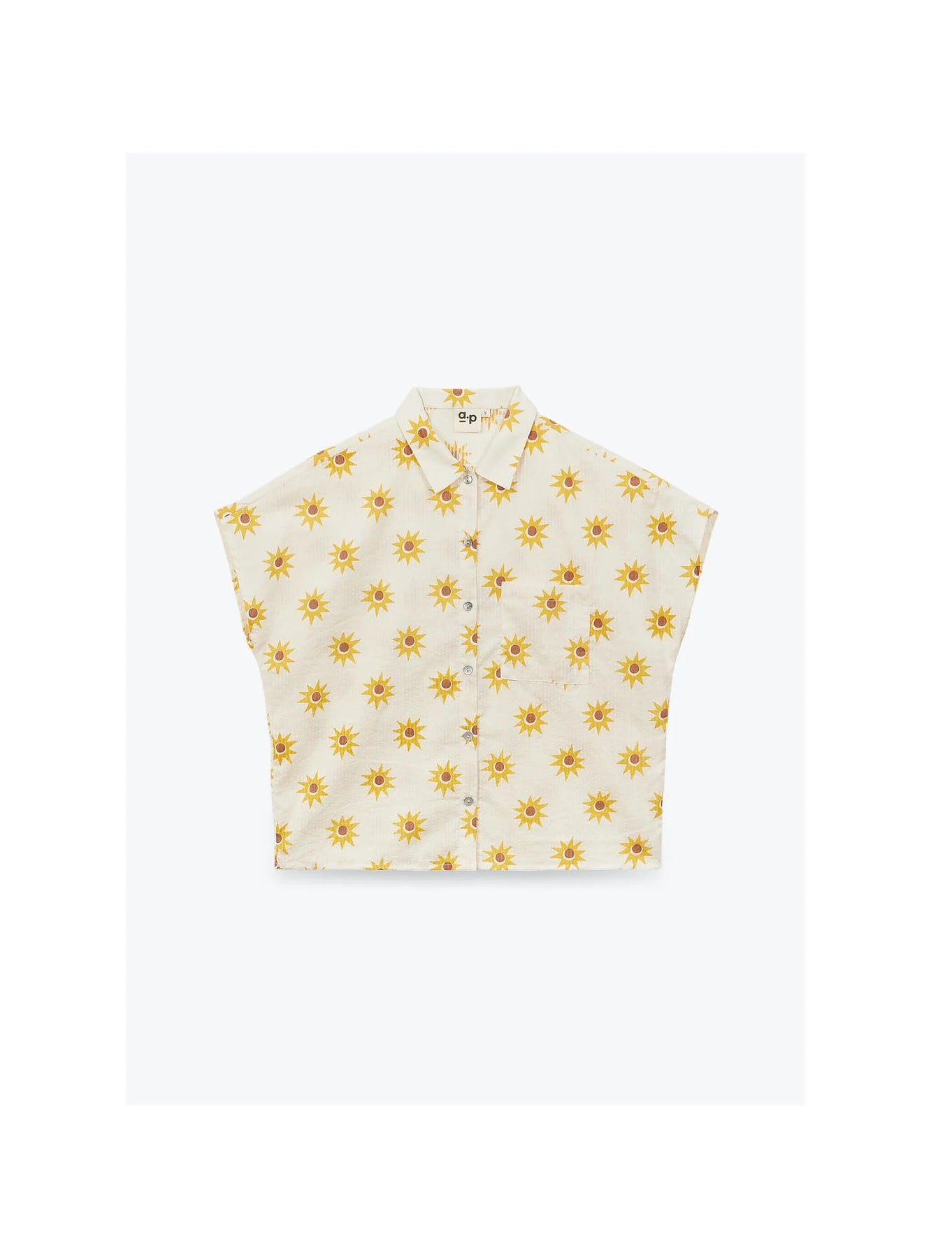 Blouse femme à imprimé exclusif soleil, confectionnée en seersucker 100 % coton. Elle présente un col chemisier, une ouverture boutonnée sur le devant et une poche plaquée sur la poitrine. Une étiquette à pois bleus est insérée dans la couture côté.