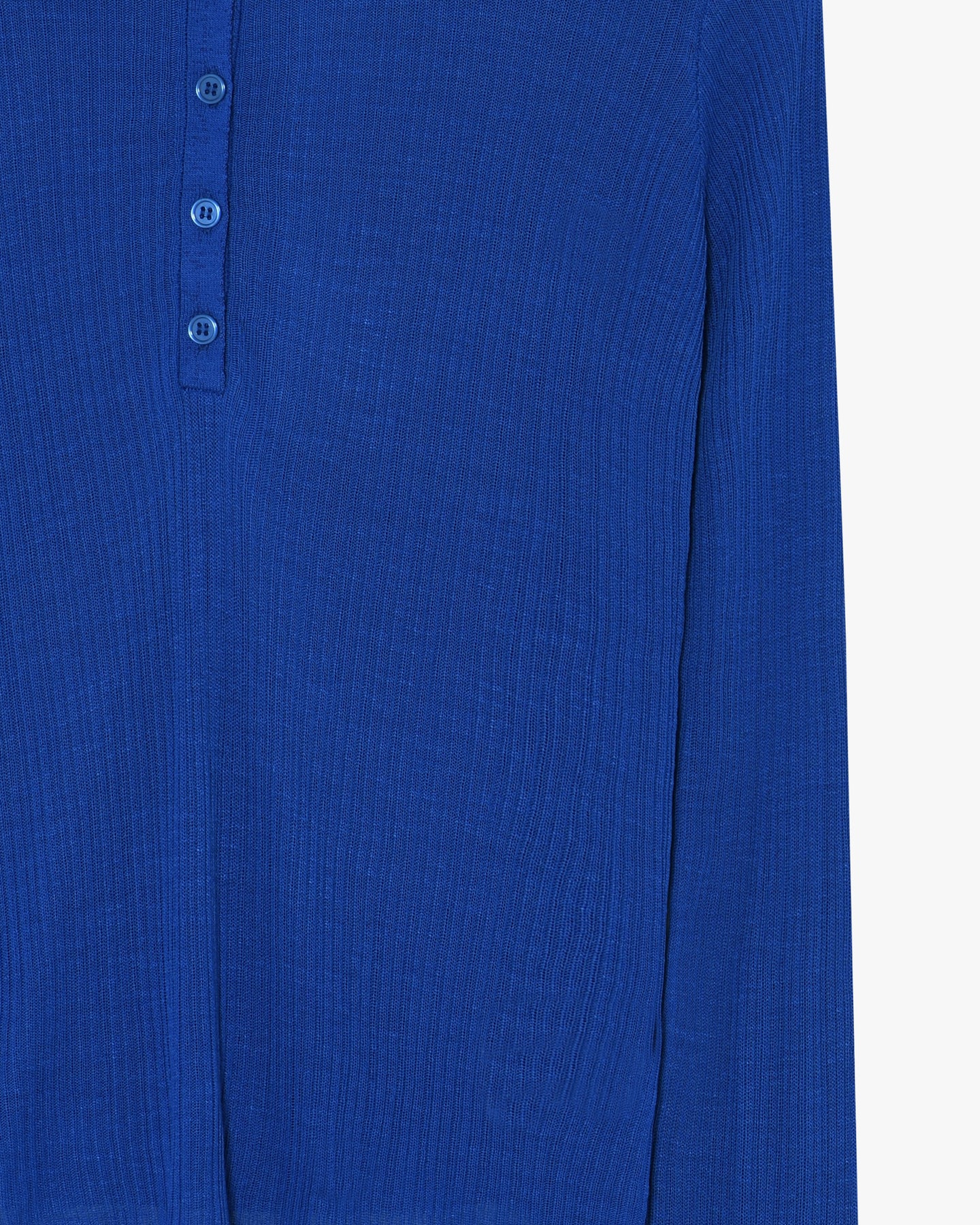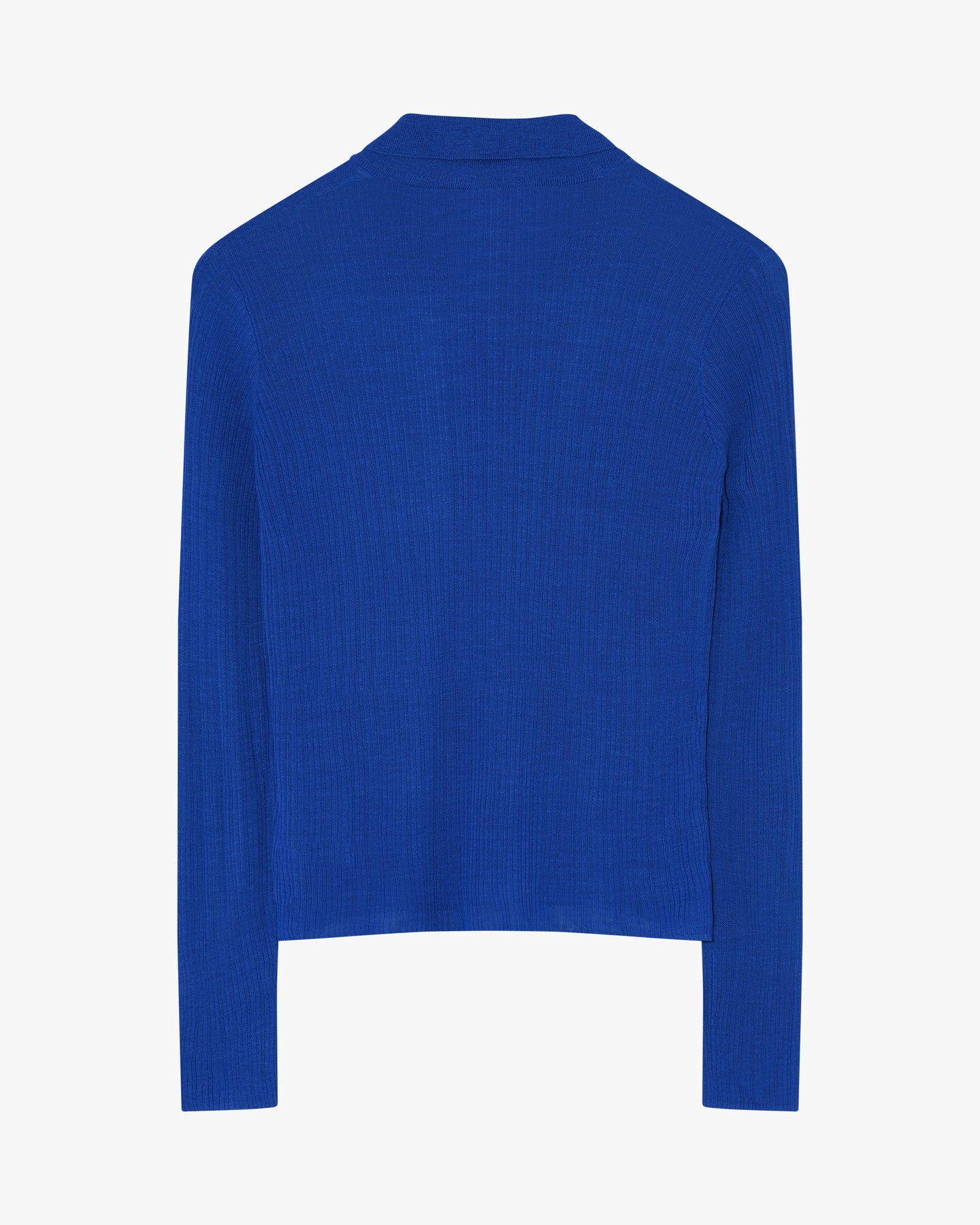 Le polo Gro est un tricot bleu léger à la texture douce et à la coupe ajustée. Assez près du corps, il présente un col classique et une patte de boutonnage à quatre petits boutons. Facile à superposer ou à porter seul, il allie confort, élégance et simplicité.