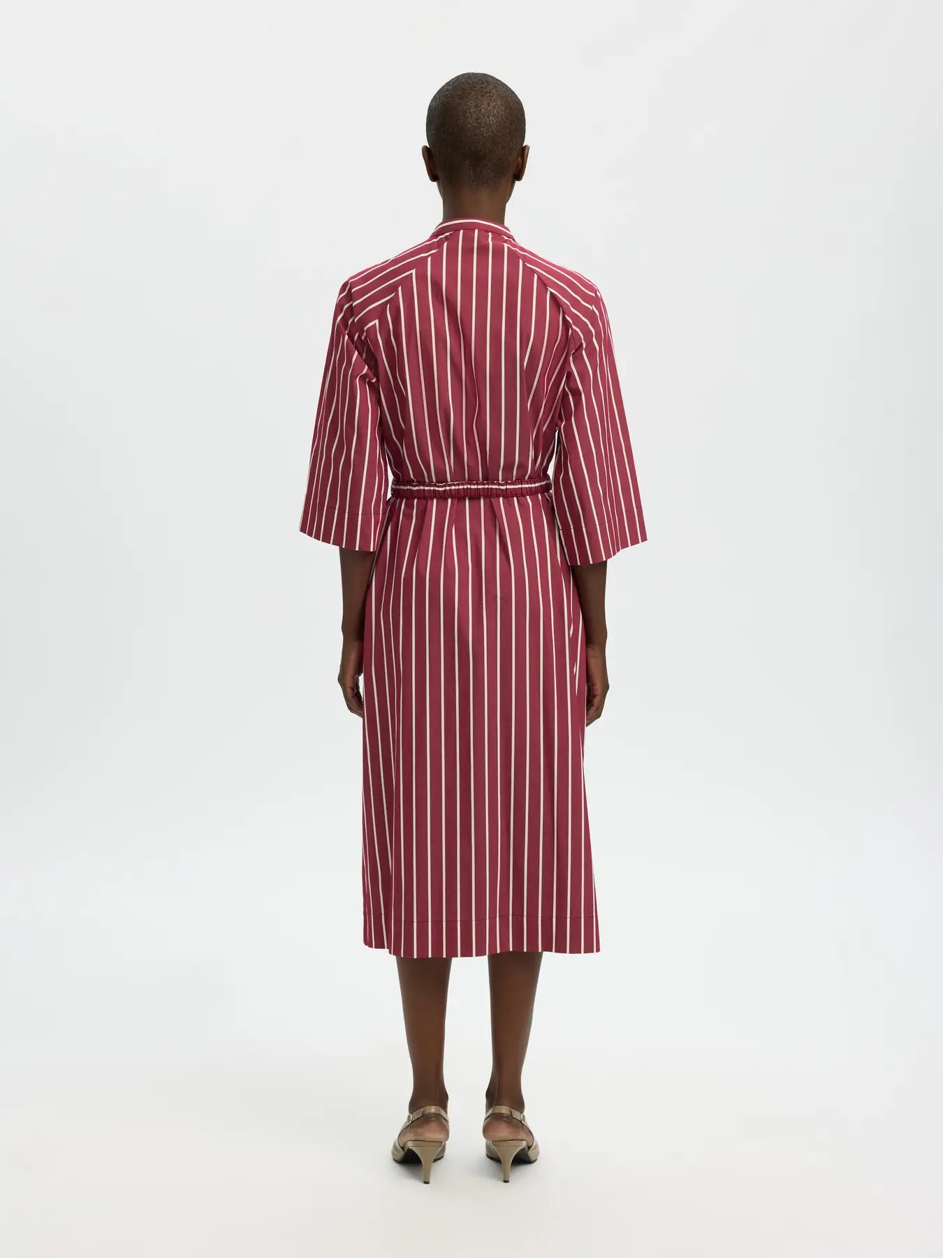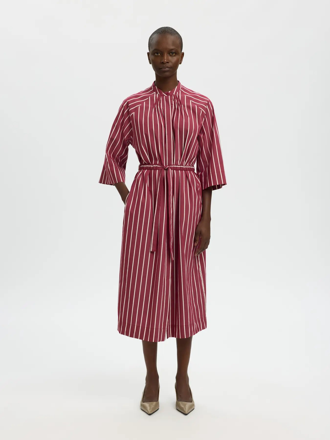 Robe midi à rayures rouges et blanches au style élégant et contemporain. Elle présente une coupe fluide avec des manches 3/4 et un col légèrement montant. Une ceinture à nouer à la taille permet de structurer la silhouette. Les rayures verticales allongent la ligne et apportent une touche graphique à cette pièce féminine et raffinée.