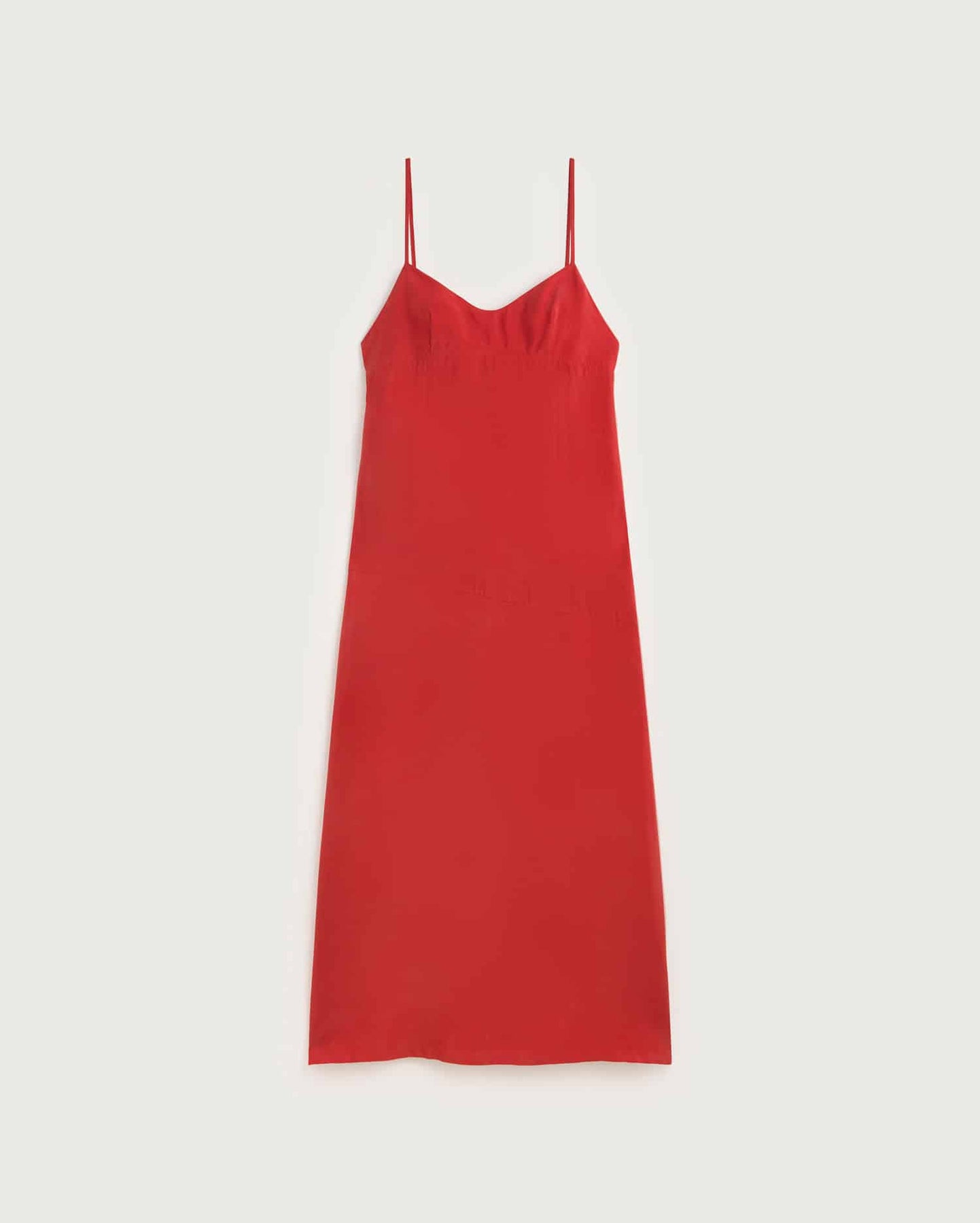 Robe longue rouge fluide de chez THINKING MU. Elle présente une coupe droite élégante, un léger décolleté et de fines bretelles qui lui apportent une touche chic et féminine.