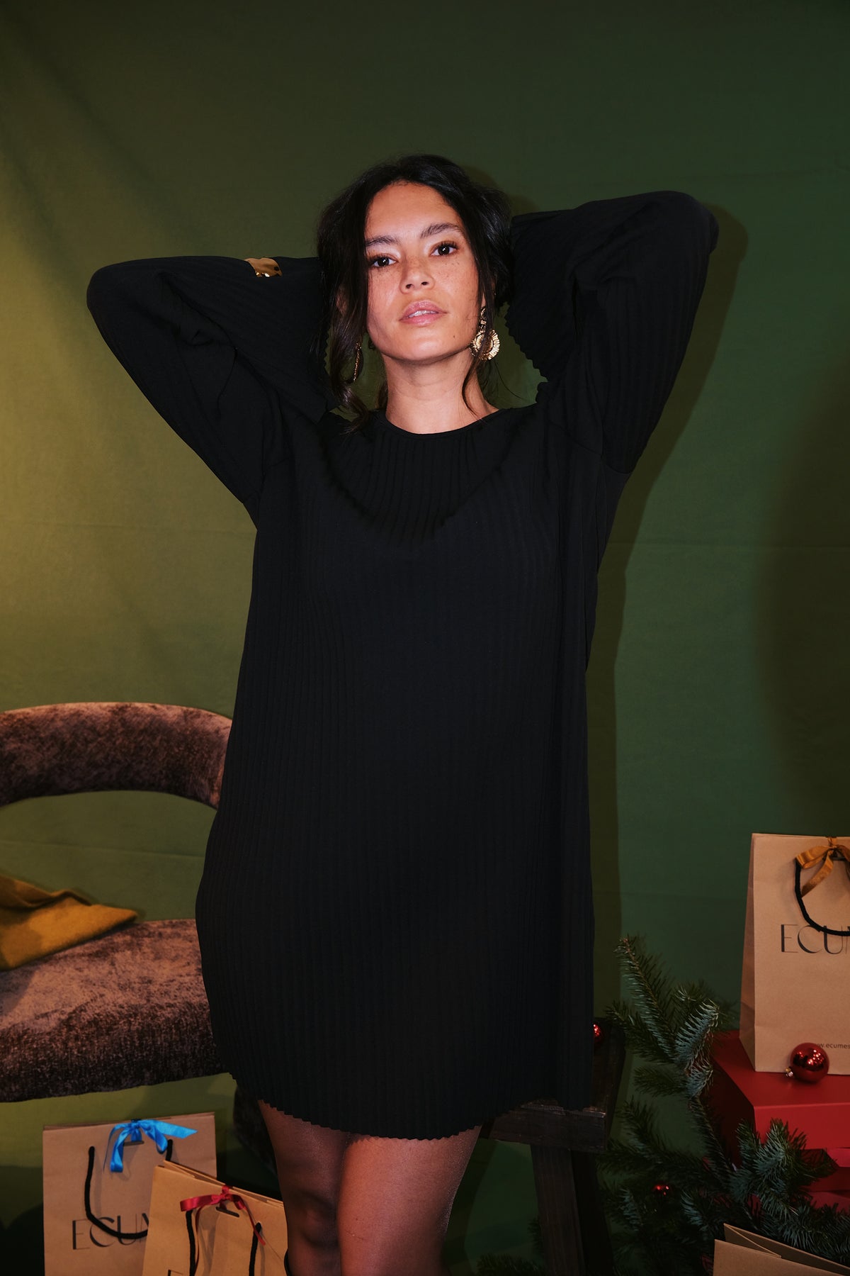 PIPPA est une robe noire signée Minimum. Elle présente une coupe droite, des manches longues et un col rond. Son tissu plissé apporte du relief et une touche d’élégance à cette pièce sobre et intemporelle.