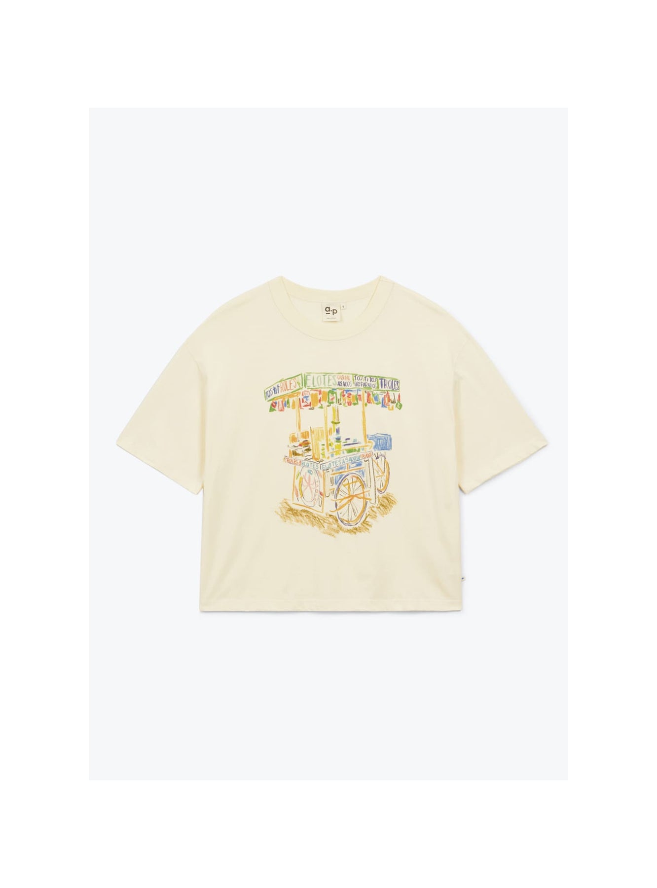 T-shirt écru manches courtes de chez ARSÈNE & LES PIPELETTES. Il a une coupe assez large et un col rond. À l'avant un illustration d'une petite épicerie colorée.