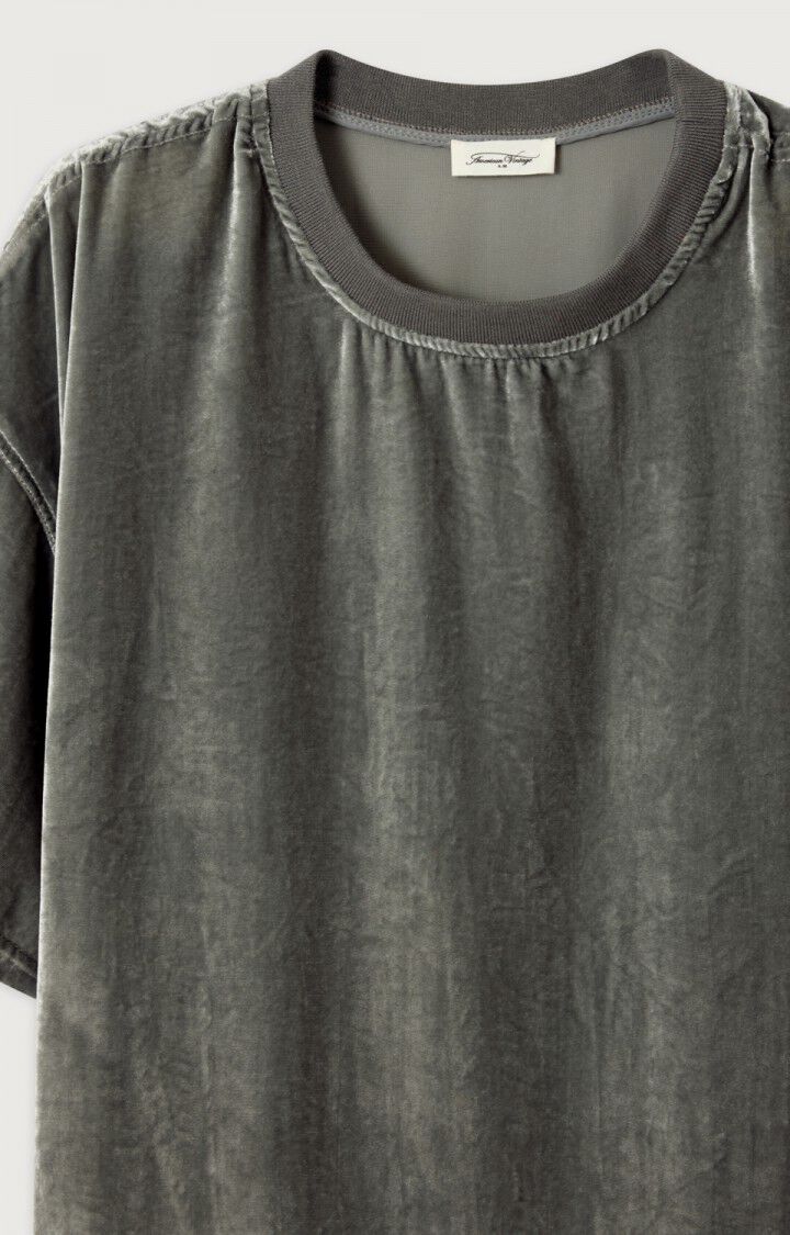 ANKAZ est un t-shirt gris American Vintage. Sa coupe ample et ses épaules tombantes lui confèrent une allure décontractée et moderne. Il est doté d’un col rond légèrement épais qui structure la silhouette. Confectionné en velours, il se distingue par sa matière originale et apporte une touche à la fois douce et élégante.