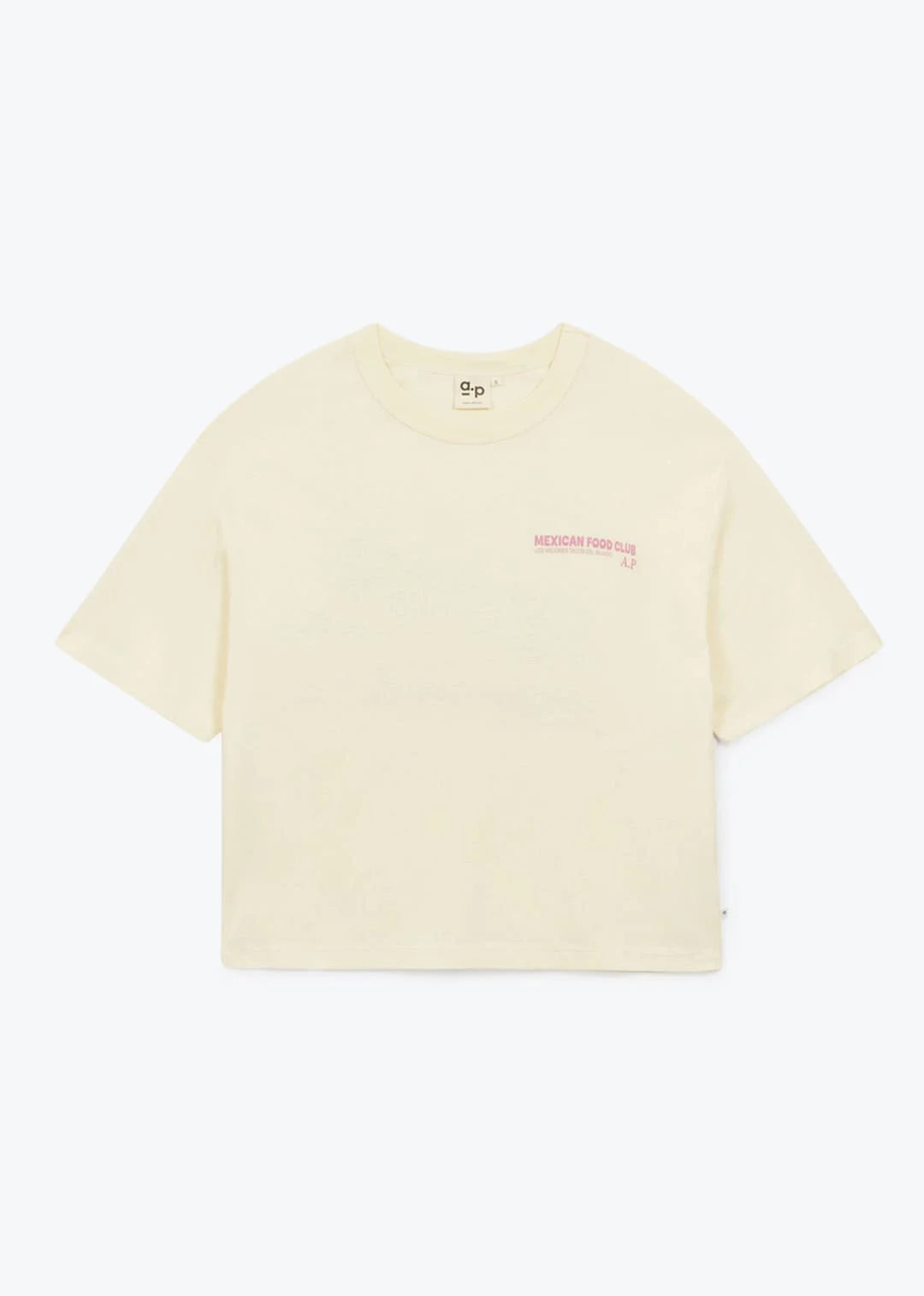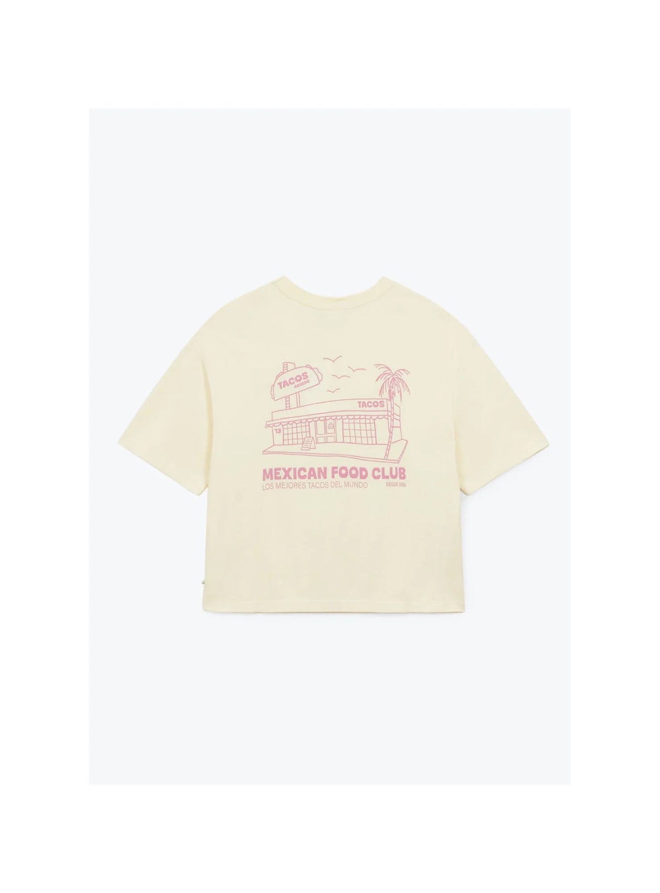 Tee shirt écru manches courtes de chez ARSÈNE & LES PIPELETTES. Coupe assez large et col rond. À l'arrière, une illustration rose d'une devanture d'un fast food mexicain et à l'avant sur la poitrine inscription en rose "MEXICAIN FOOD CLUB".