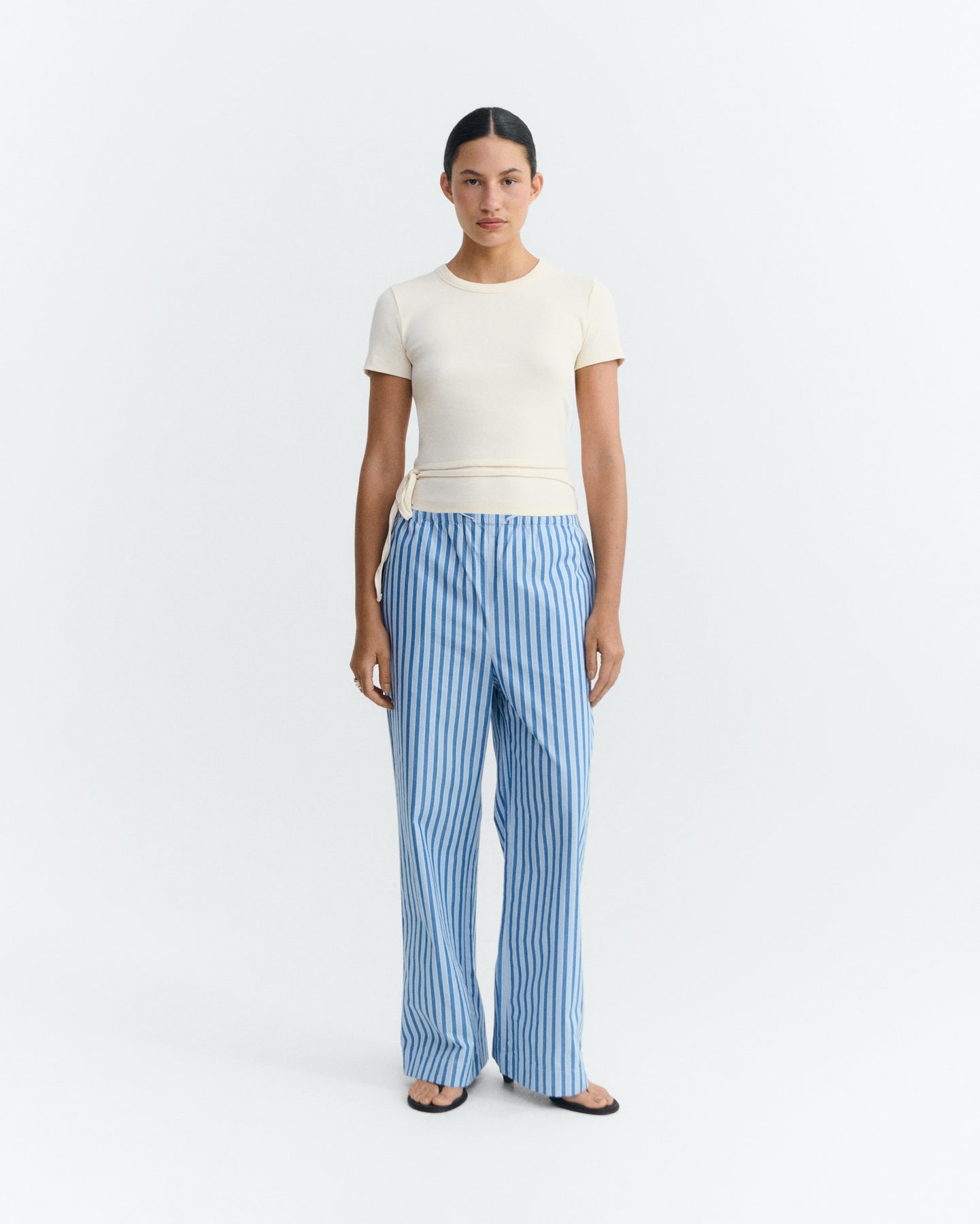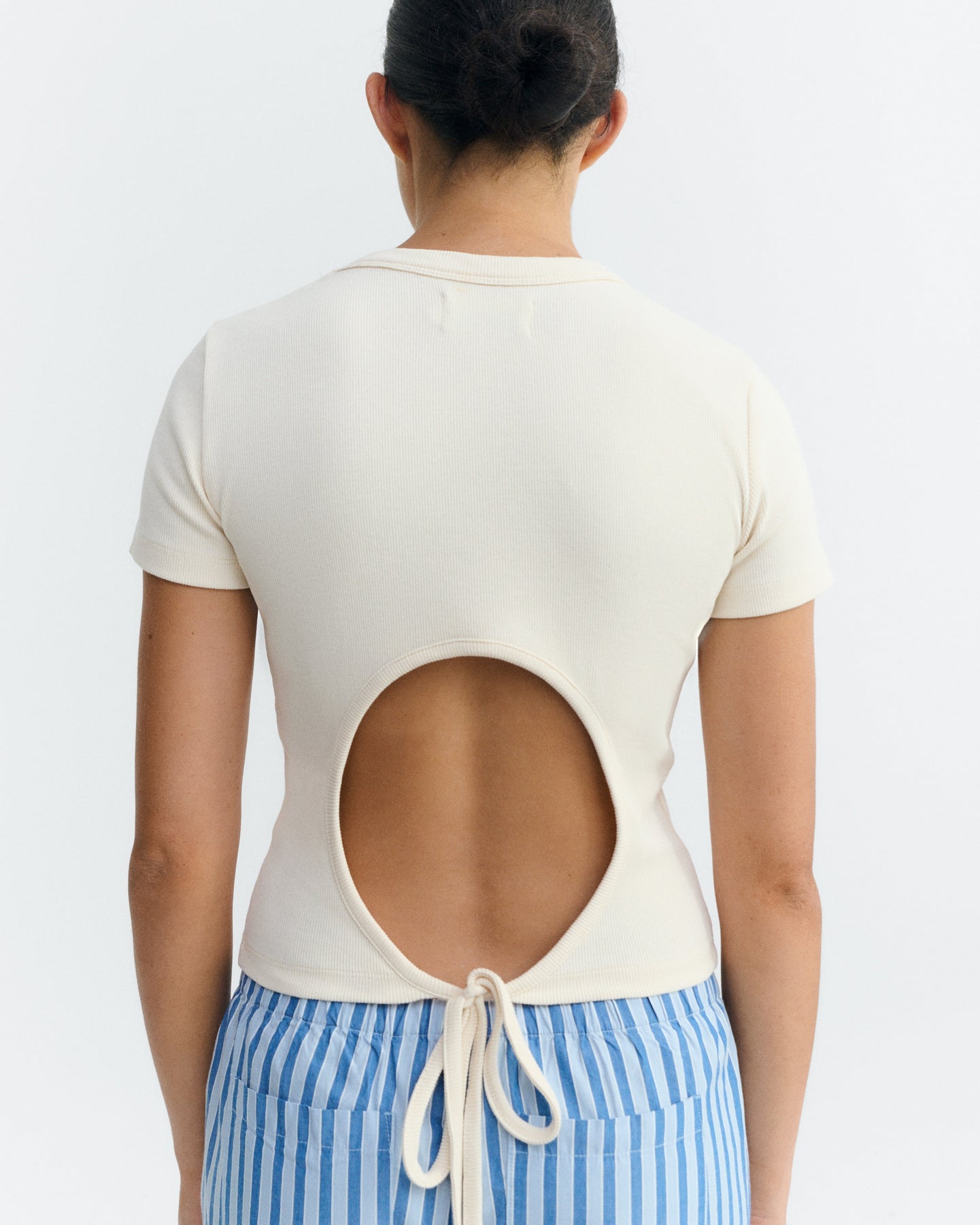 Ce modèle présente une coupe ajustée et un col rond classique. Confectionné dans une matière côtelée, il se distingue par une large ouverture arrondie dans le dos, sublimée par un lien à nouer en bas pour un ajustement personnalisé. Une pièce féminine et moderne, idéale pour la saison.