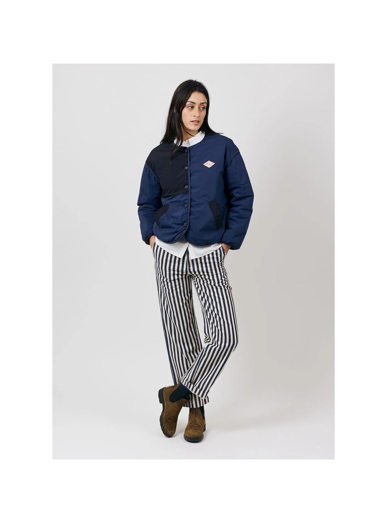 Blouson femme réversible marine en tissu technique déperlant. Un côté matelassé pour le confort, un côté non matelassé avec empiècement noir contrasté et deux poches passepoilées. Col rond, ouverture boutonnée et finitions soignées, signé AP & CO.